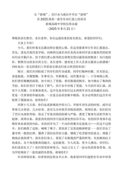 / 领导讲话:20250930新城高级中学校长周永超:在2025级高一新生军训汇演上的讲话