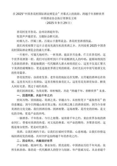 领导讲话:20250930中国酒业协会执行理事长王琦:在2025“中国杏花村国际酒业博览会”开幕式上的致辞:跨越千年香醉世界