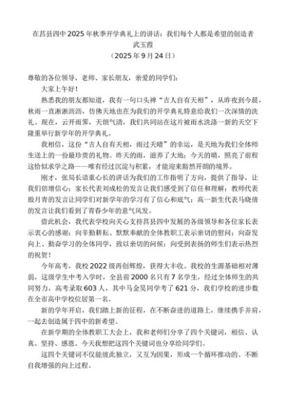 领导讲话:20250930武玉霞:在莒县四中2025年秋季开学典礼上的讲话:我们每个人都是希望的创造者