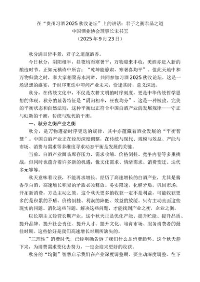 / 领导讲话:20250930中国酒业协会理事长宋书玉:在“贵州习酒2025秋收论坛”上的讲话:君子之衡君品之道