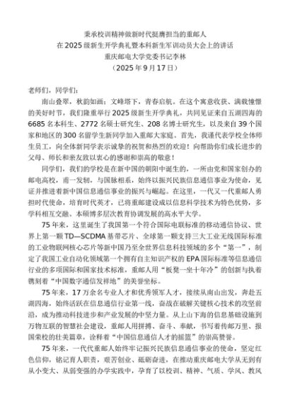 / 领导讲话:20250930重庆邮电大学党委书记李林:在2025级新生开学典礼暨本科新生军训动员大会上的讲话