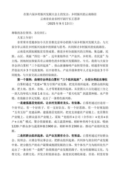 / 领导讲话:20250930云南省农业农村厅副厅长王思泽:在第六届乡村振兴发展大会上的发言:乡村振兴的云南路径