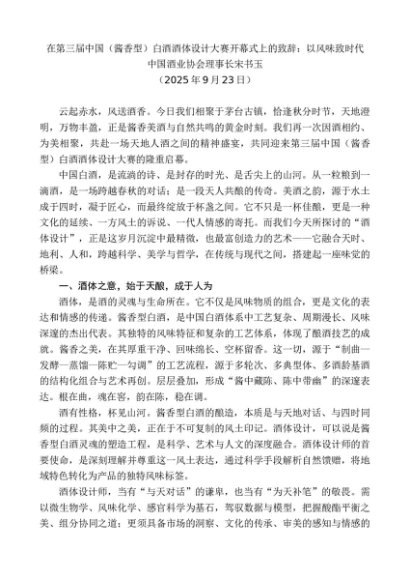 / 领导讲话:20250930中国酒业协会理事长宋书玉:在第三届中国(酱香型)白酒酒体设计大赛开幕式上的致辞:以风味致时代