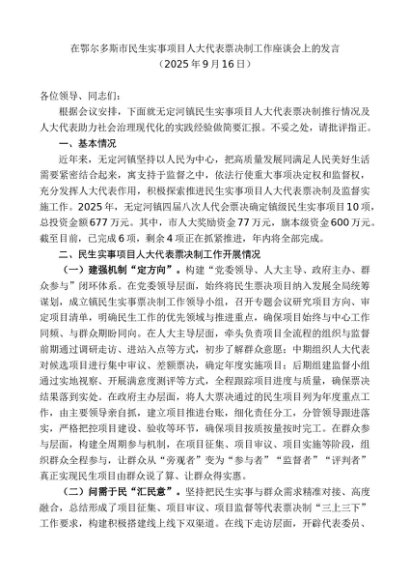 / 领导讲话:20250930在鄂尔多斯市民生实事项目人大代表票决制工作座谈会上的发言