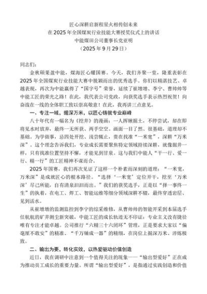 / 领导讲话:20250930中能煤田公司董事长党亚明:在2025年全国煤炭行业技能大赛授奖仪式上的讲话