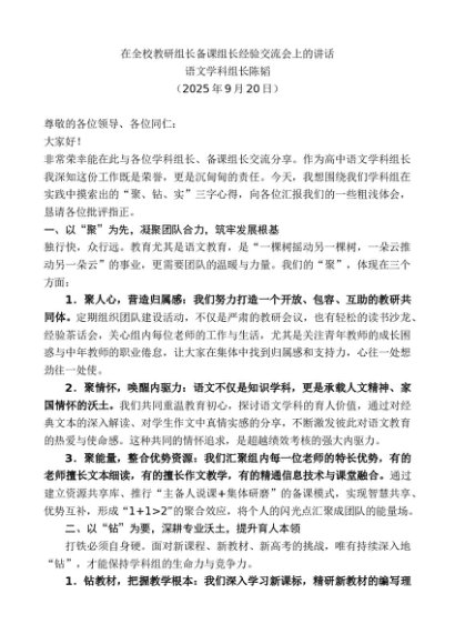 / 领导讲话:20250930语文学科组长陈韬:在全校教研组长备课组长经验交流会上的讲话