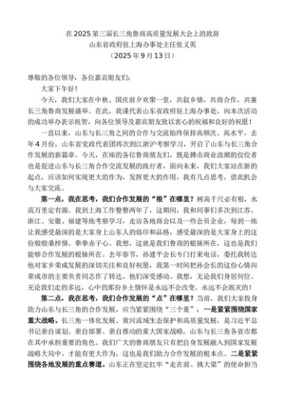 / 领导讲话:20250930山东省政府驻上海办事处主任张义英:在2025第三届长三角鲁商高质量发展大会上的致辞