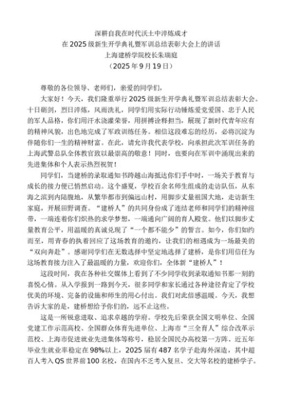 / 领导讲话:20250930上海建桥学院校长朱瑞庭:在2025级新生开学典礼暨军训总结表彰大会上的讲话