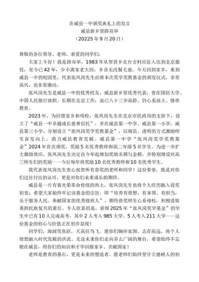 / 领导讲话:20250930威县新乡贤薛双举:在威县一中颁奖典礼上的发言