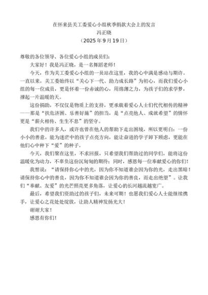 / 领导讲话:20250930冯正晓:在怀来县关工委爱心小组秋季捐款大会上的发言