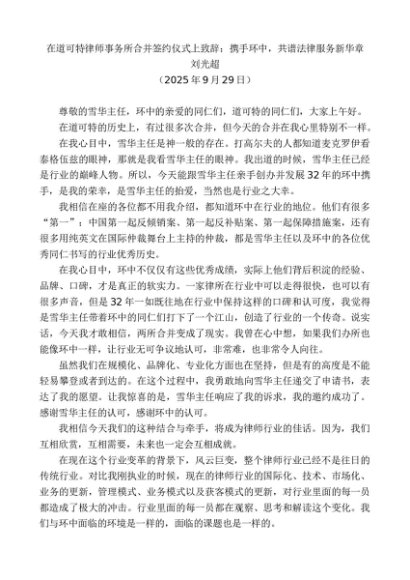 / 领导讲话:20250930刘光超:在道可特律师事务所合并签约仪式上致辞:携手环中,共谱法律服务新华章