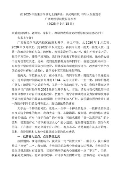 / 领导讲话:20250930广西财经学院校长范祚军:在2025年新生开学典礼上的讲话:从武鸣启航书写人生新篇章
