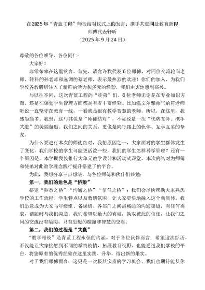 / 领导讲话:20250930师傅代表轩昕:在2025年“青蓝工程”师徒结对仪式上的发言:携手共进同赴教育新程