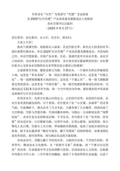 / 领导讲话:20250930赤水市委书记汪能科:在2025“以竹代塑”产业高质量发展推进会上的致辞