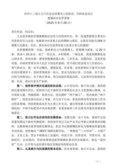 / 领导讲话:20250930楚雄州州长罗景锋:在州十三届人大六次会议闭幕式上的讲话:任职表态发言
