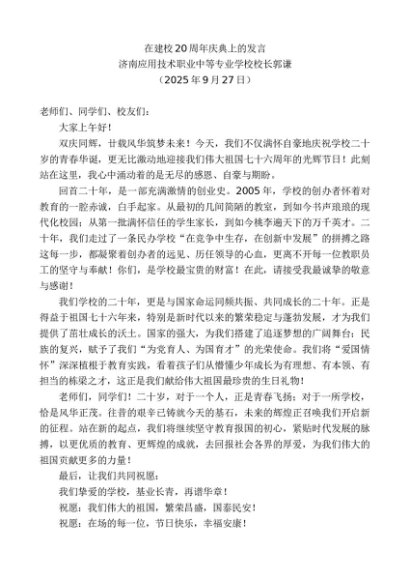 / 领导讲话:20250930济南应用技术职业中等专业学校校长郭谦:在建校20周年庆典上的发言