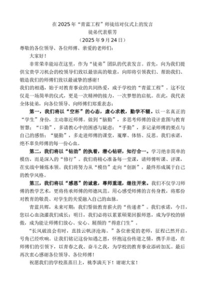 / 领导讲话:20250930徒弟代表蔡芳:在2025年“青蓝工程”师徒结对仪式上的发言