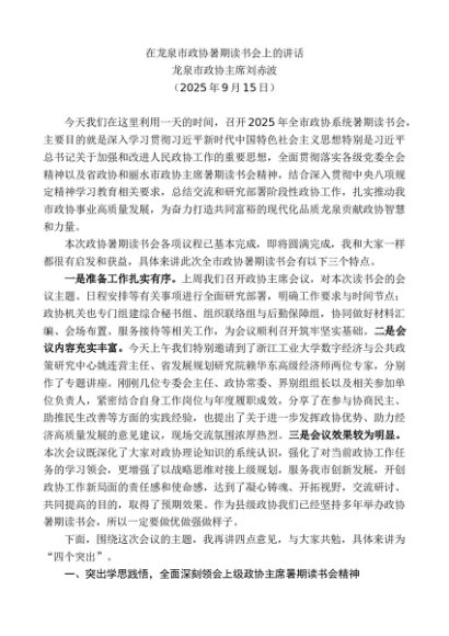 / 领导讲话:20250930龙泉市政协主席刘赤波:在龙泉市政协暑期读书会上的讲话