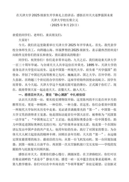 领导讲话:20250930天津大学校长柴立元:在天津大学2025级新生开学典礼上的讲话:感悟百卅天大逐梦强国未来