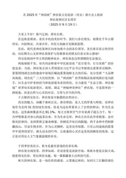 / 领导讲话:20250930神农架林区区长周军:在2025年“神武峡”神农架文化旅游(西安)推介会上致辞