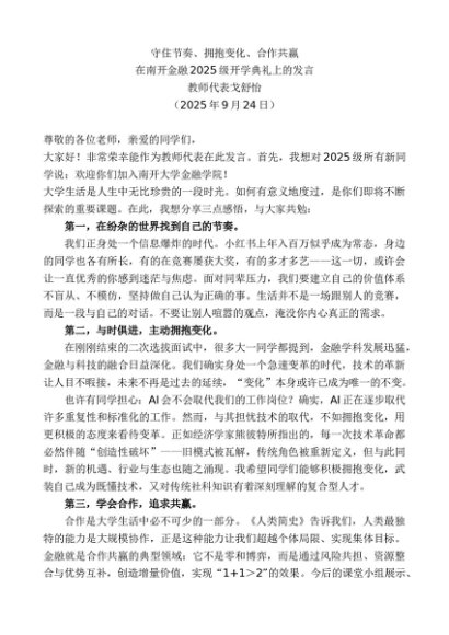 / 领导讲话:20250930教师代表戈舒怡:在南开金融2025级开学典礼上的发言