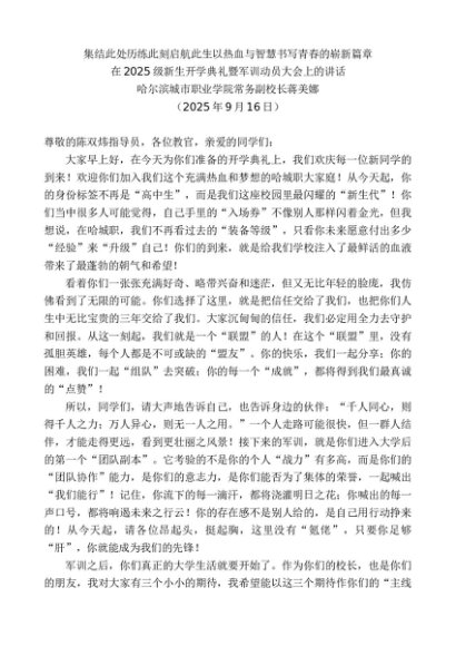 / 领导讲话:20250930哈尔滨城市职业学院常务副校长蒋美娜:在2025级新生开学典礼暨军训动员大会上的讲话