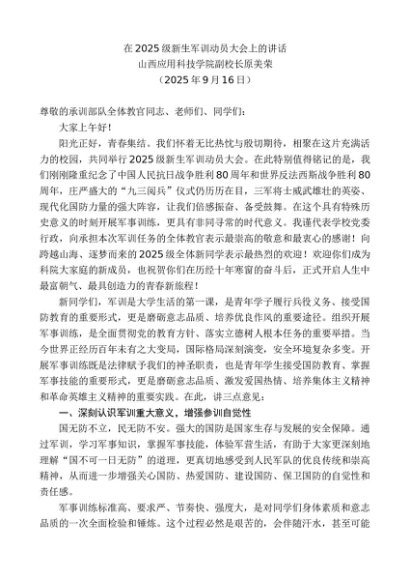 / 领导讲话:20250930山西应用科技学院副校长原美荣:在2025级新生军训动员大会上的讲话