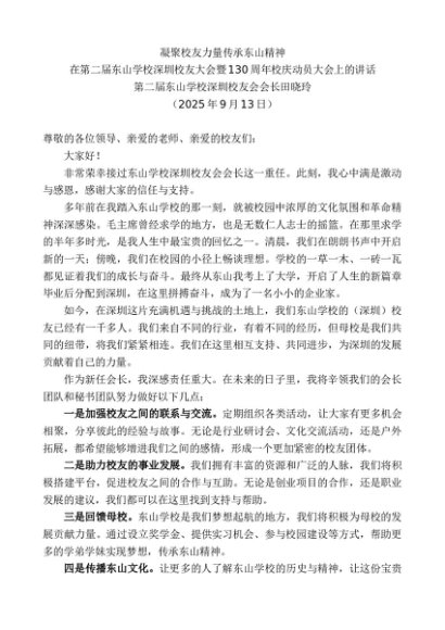 / 领导讲话:20250930田晓玲:在第二届东山学校深圳校友大会暨130周年校庆动员大会上的讲话