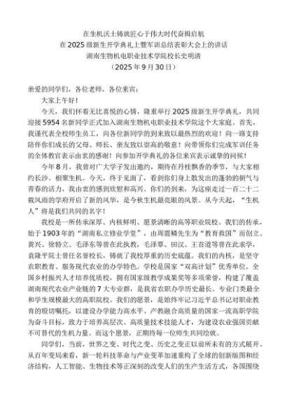 / 领导讲话:20250930湖南生物机电职业技术学院校长史明清:在2025级新生开学典礼上暨军训总结表彰大会上的讲话
