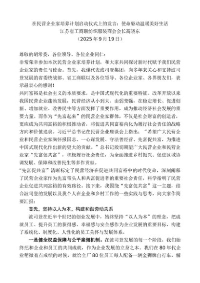 / 领导讲话:20250930江苏省工商联纺织服装商会会长高晓东:在民营企业家培养计划启动仪式上的发言