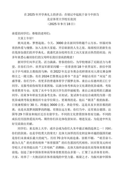 领导讲话:20250930北京体育大学校长张剑:在2025年开学典礼上的讲话:在铭记中起航于奋斗中担当