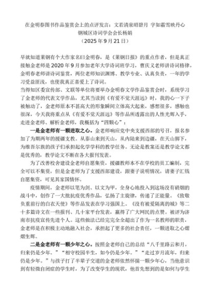 领导讲话:20250930钢城区诗词学会会长杨娟:在金明春图书作品鉴赏会上的点评发言:文若清泉昭碧月字如霜雪映丹心