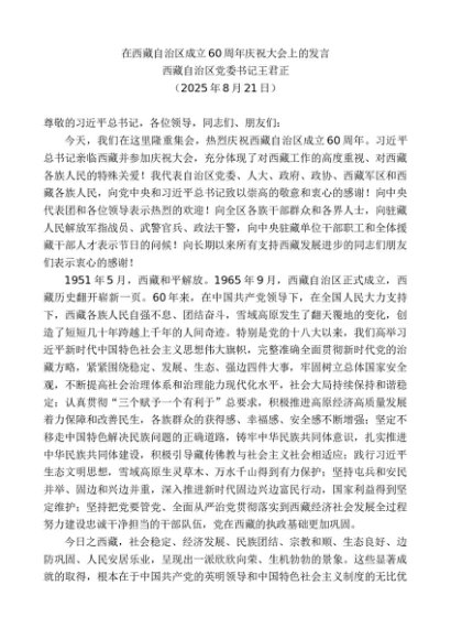 / 领导讲话:20250930西藏自治区党委书记王君正:在西藏自治区成立60周年庆祝大会上的发言