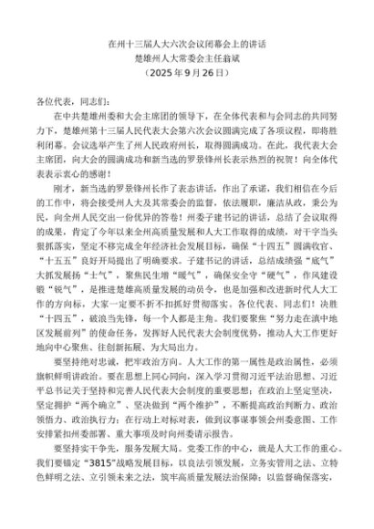 / 领导讲话:20250930楚雄州人大常委会主任翁斌:在州十三届人大六次会议闭幕会上的讲话