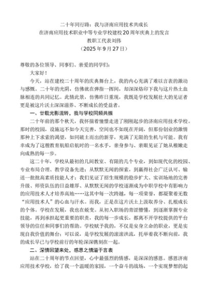 / 领导讲话:20250930教职工代表刘伟:在济南应用技术职业中等专业学校建校20周年庆典上的发言