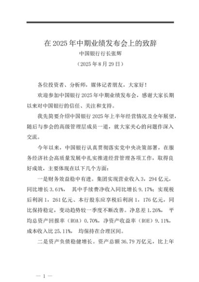 / 领导讲话:20250829在2025年中期业绩发布会上的致辞——中国银行行长张辉
