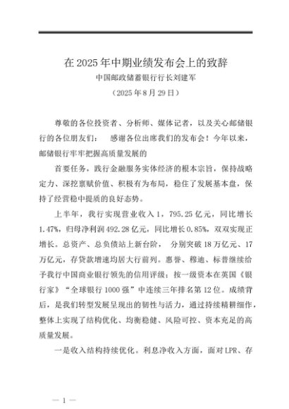 领导讲话:20250829在2025年中期业绩发布会上的致辞——中国邮政储蓄银行行长刘建军