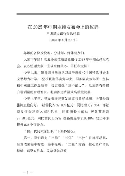 / 领导讲话:20250829在2025年中期业绩发布会上的致辞——中国建设银行行长张毅