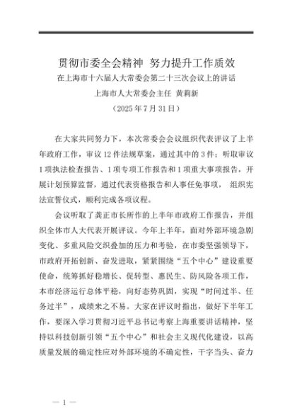 / 领导讲话:20250731在上海市十六届人大常委会第二十三次会议上的讲话——上海市人大常委会主任 黄莉新