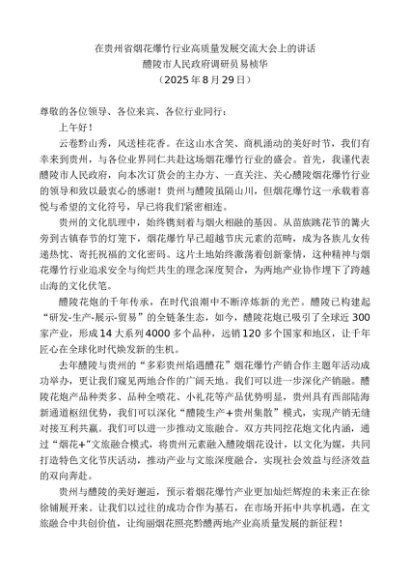 / 领导讲话:20250829醴陵市人民政府调研员易桢华:在贵州省烟花爆竹行业高质量发展交流大会上的讲话