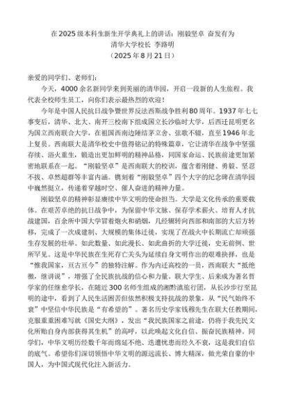 / 领导讲话:20250821清华大学校长李路明:在2025级本科生新生开学典礼上的讲话:刚毅坚卓奋发有为