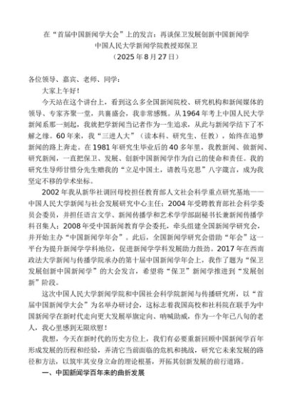 / 领导讲话:20250827中国人民大学郑保卫:在“首届中国新闻学大会”上的发言:再谈保卫发展创新中国新闻学