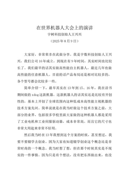 / 领导讲话:20250809在世界机器人大会上的演讲——宇树科技创始人王兴