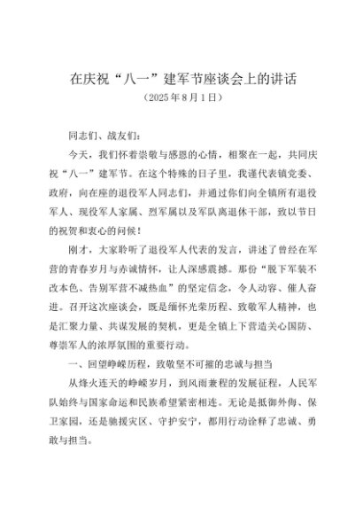 / 领导讲话:20250801在庆祝“八一”建军节座谈会上的讲话——镇党委书记