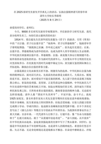 / 领导讲话:20250829清华大学校长李路明:在2025级研究生新生开学典礼上的讲话:弘扬自强精神谱写青春华章