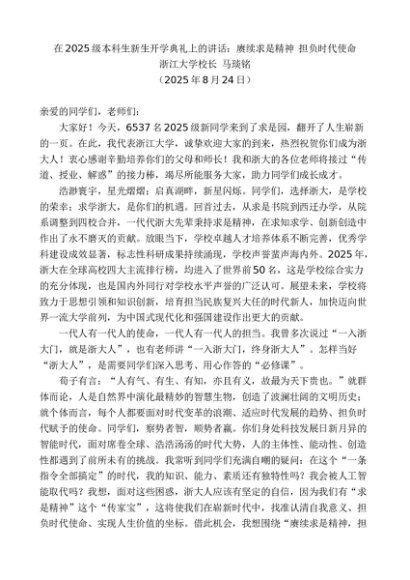 / 领导讲话:20250824浙江大学校长马琰铭:在2025级本科生新生开学典礼上的讲话:赓续求是精神担负时代使命