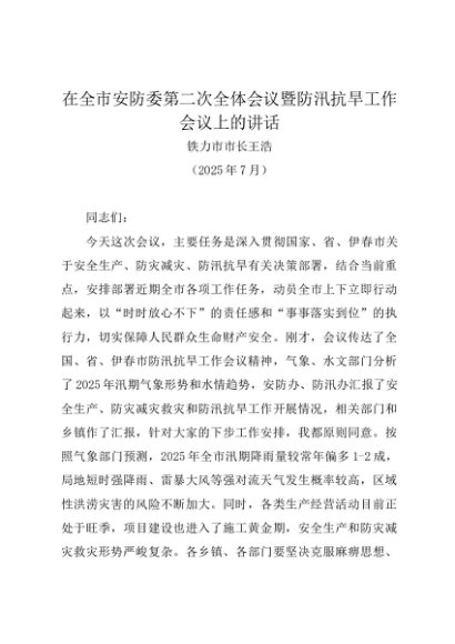 / 领导讲话:20250730在全市安防委第二次全体会议暨防汛抗旱工作会议上的讲话——铁力市市长王浩