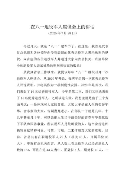 / 领导讲话:20250801在八一退役军人座谈会上的讲话——省总工会主席