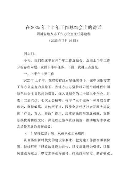 / 领导讲话:20250716在2025年上半年工作总结会上的讲话——四川省地方志工作办公室主任陈建春