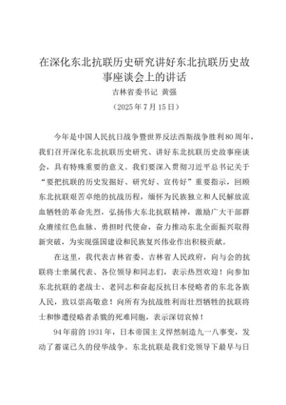 / 领导讲话:20250715在深化东北抗联历史研究讲好东北抗联历史故事座谈会上的讲话——吉林省委书记 黄强
